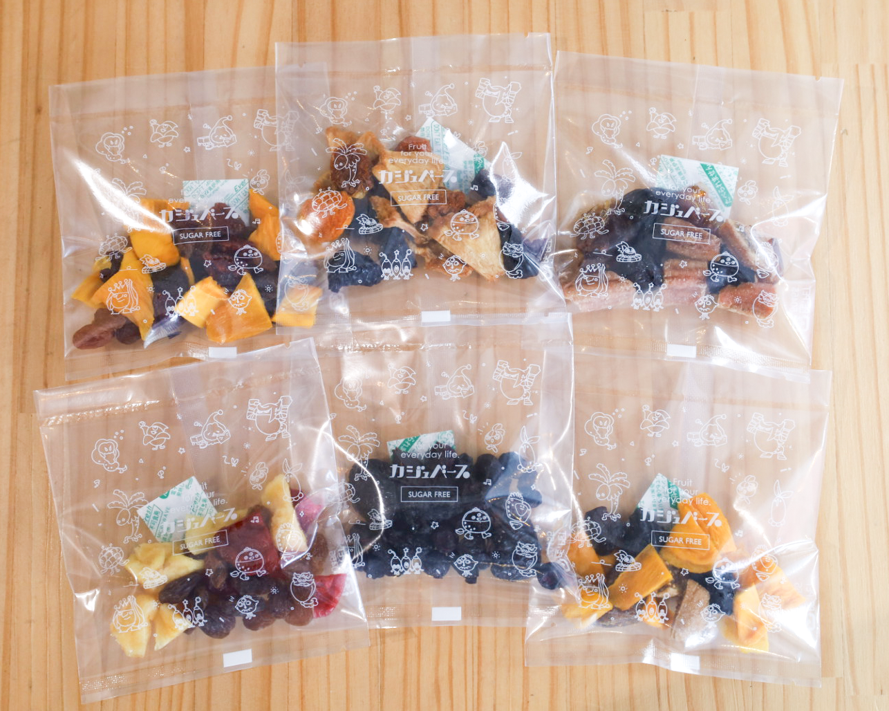 小分けにした砂糖不使用・無添加のドライフルーツミックスが6種類が2袋ずつ入ったセットです。