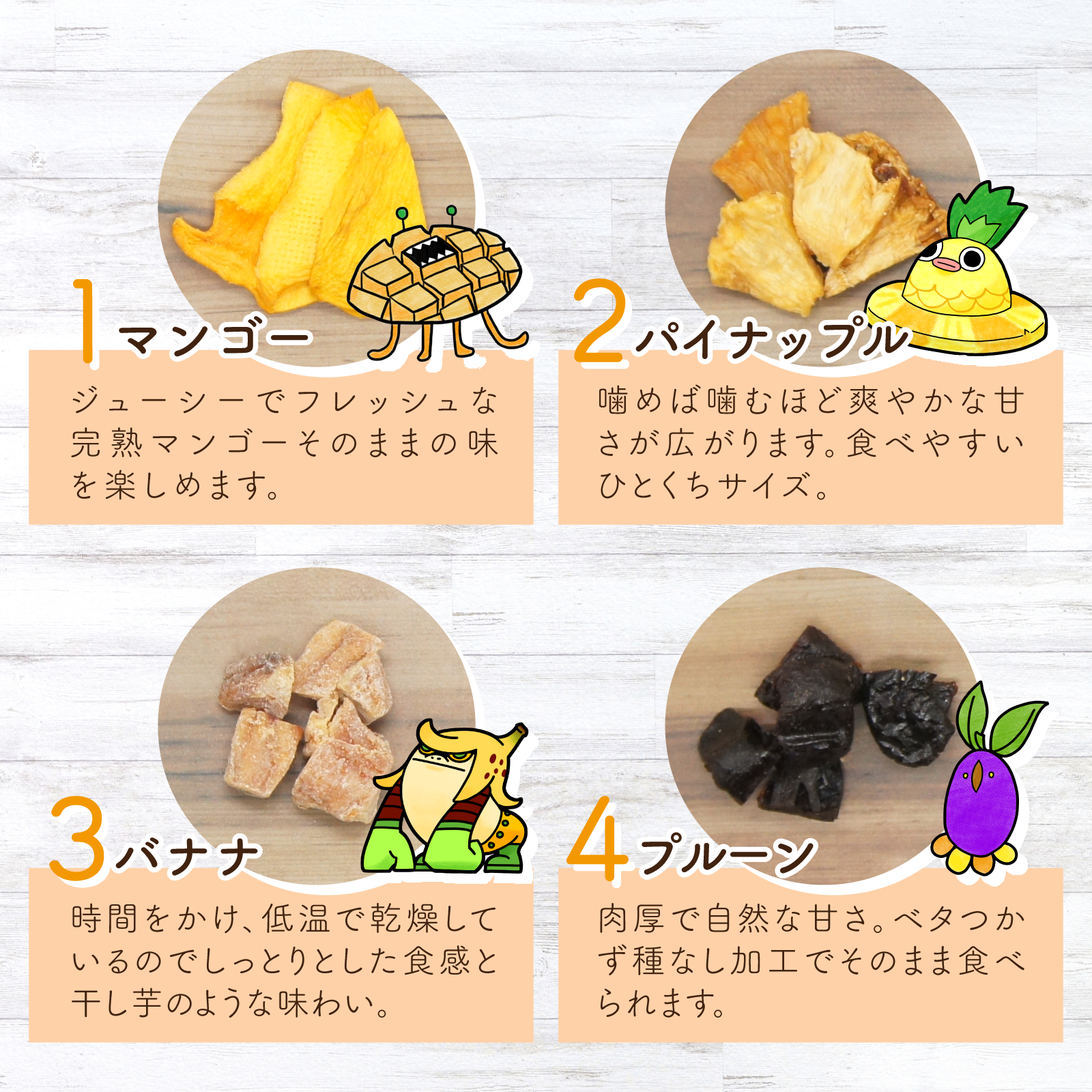 | 原産国 | カンボジア(マンゴー、パイナップル、バナナ)、アメリカ(プルーン、クランベリー)、セルビア(いちご、カシス)、ペルー(インカベリー) |