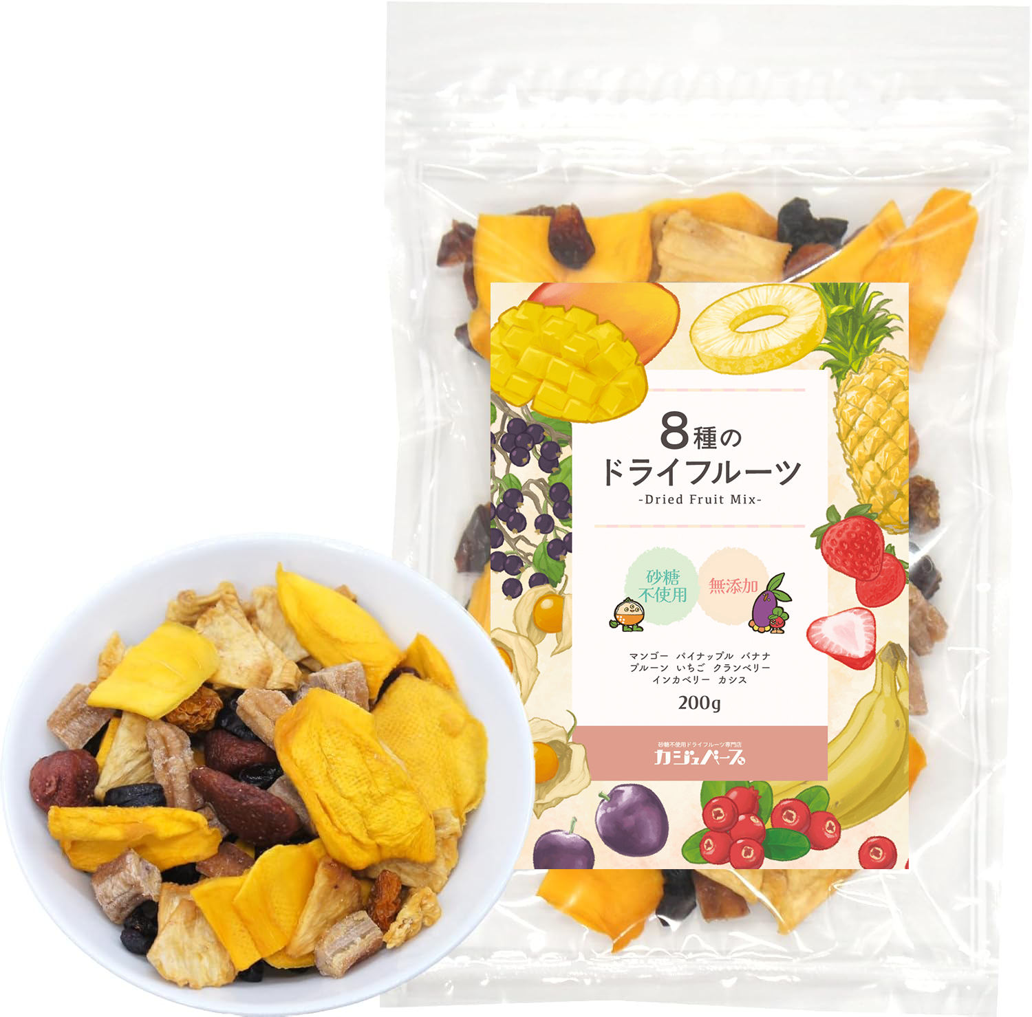 マンゴー、パイナップル、バナナ、プルーン、いちご、クランベリー、カシス、インカベリーが入った8種のドライフルーツミックスです。