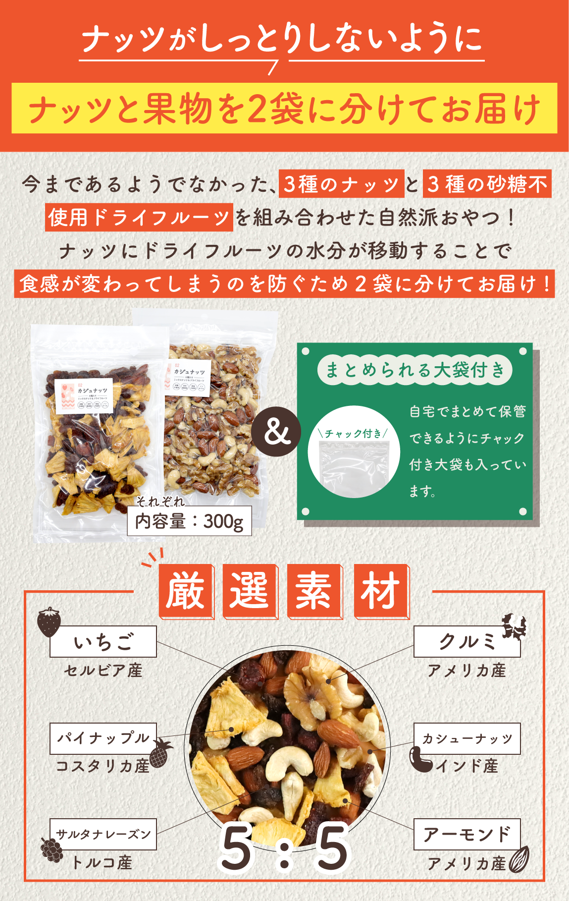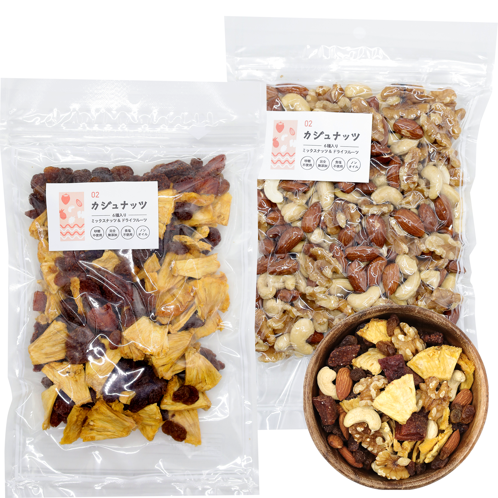 カジュナッツではそれを防ぐため、ナッツとドライフルーツを分けて包装しお届けいたします。