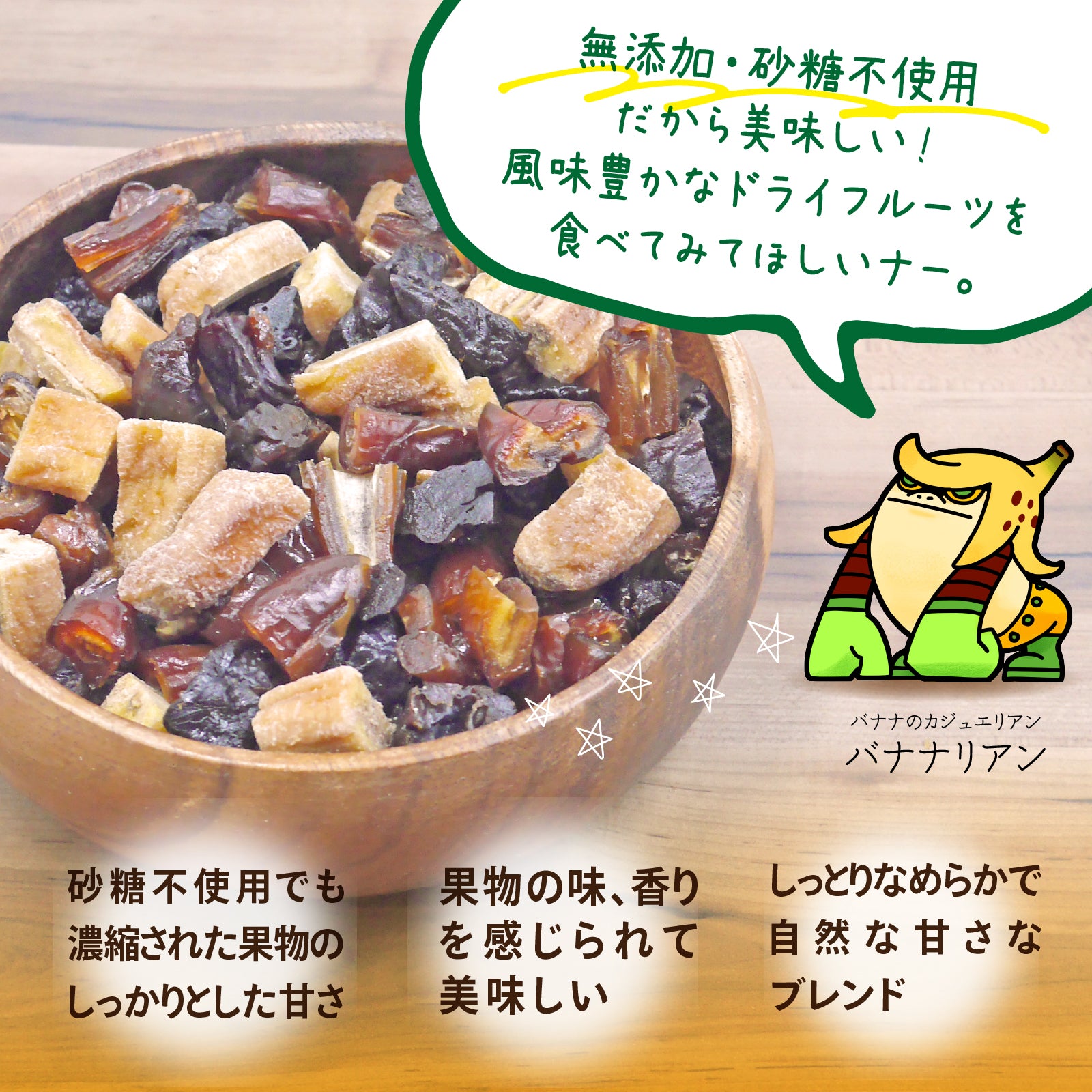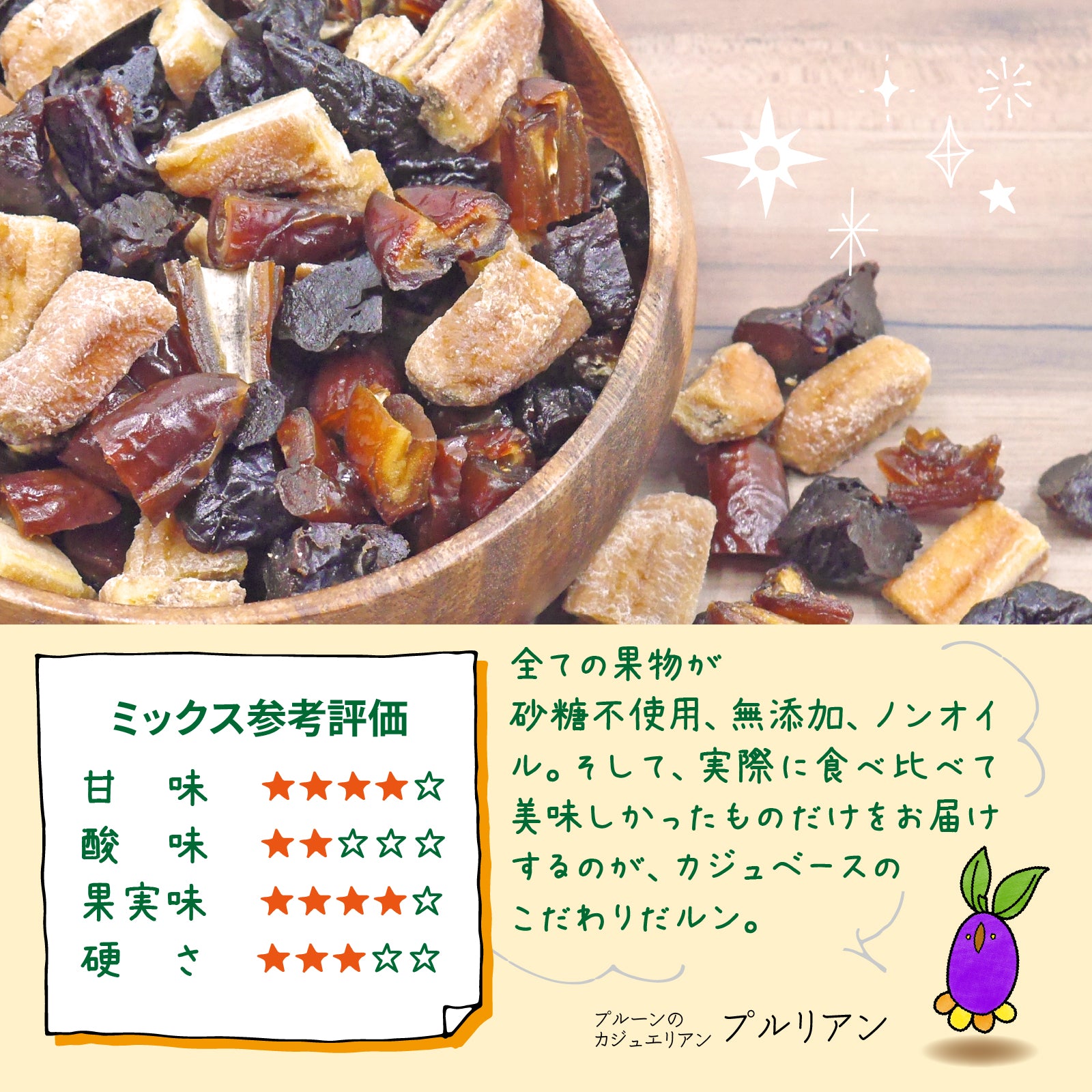 | 原産国 | デーツ(チュニジア)、バナナ (カンボジア) 、プルーン(アメリカ) |